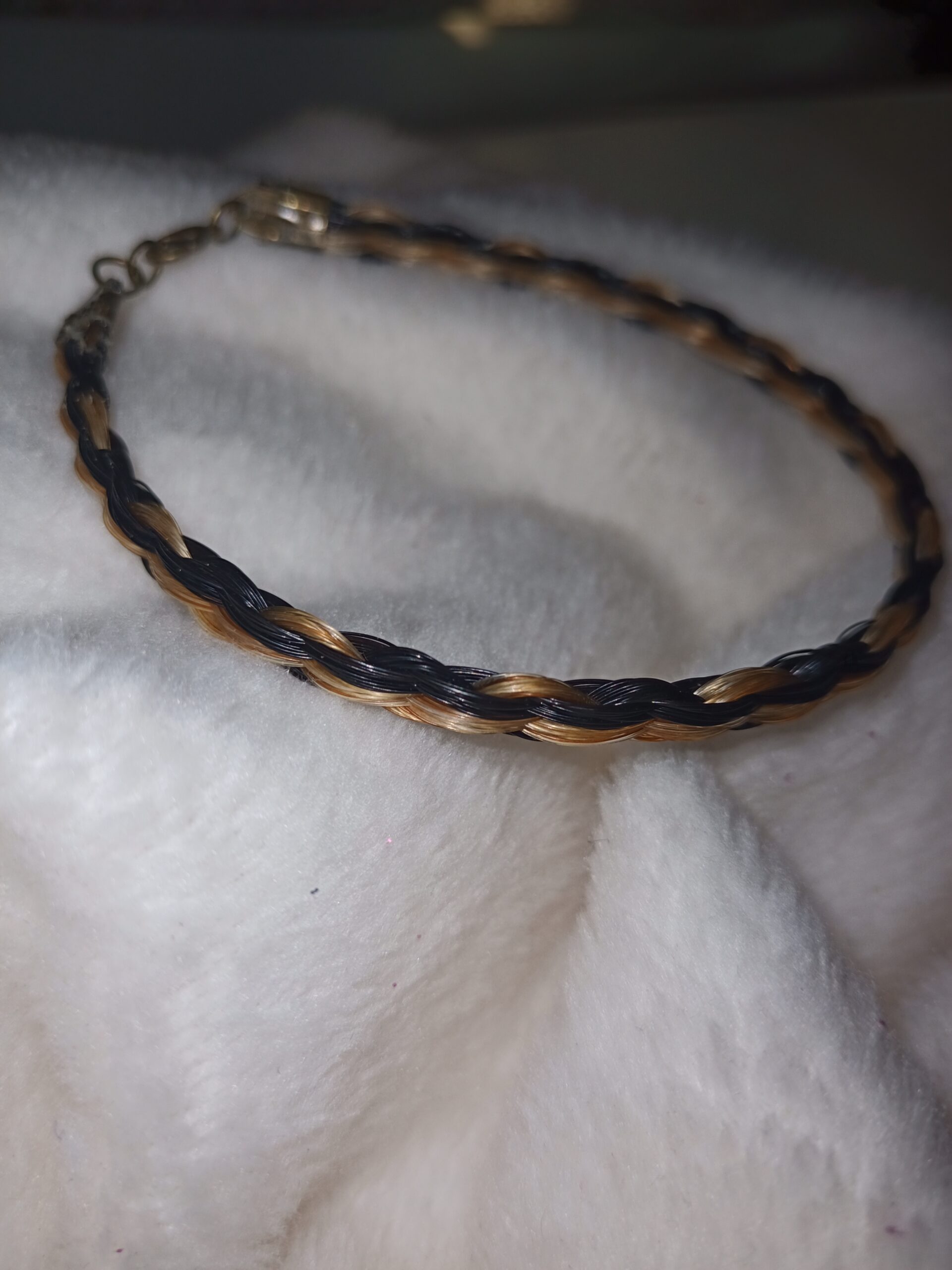 Celebrate the bond between you and your horse with this beautifully handcrafted braided horsehair bracelet, created from naturally blended dark and blonde tail hair. Each bracelet is braided entirely by hand, using slow, intentional craftsmanship that highlights the natural texture, strength, and movement of genuine horsehair. The result is a meaningful keepsake that feels elegant, personal, and deeply connected to the spirit of the horse.
