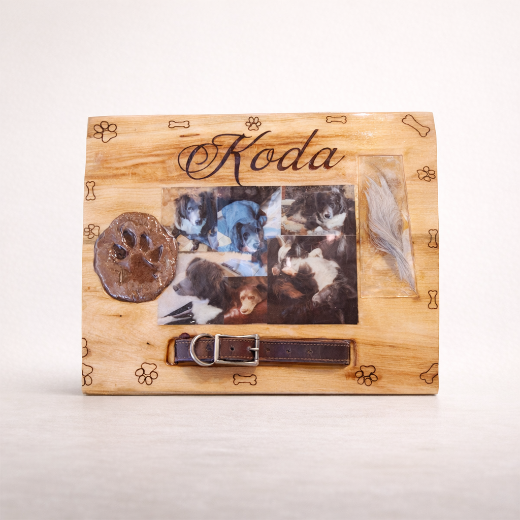 A heartfelt, handcrafted memorial plaque featuring your pet’s name, photos, paw print, fur keepsake, and original collar — a beautiful tribute to keep their memory close.